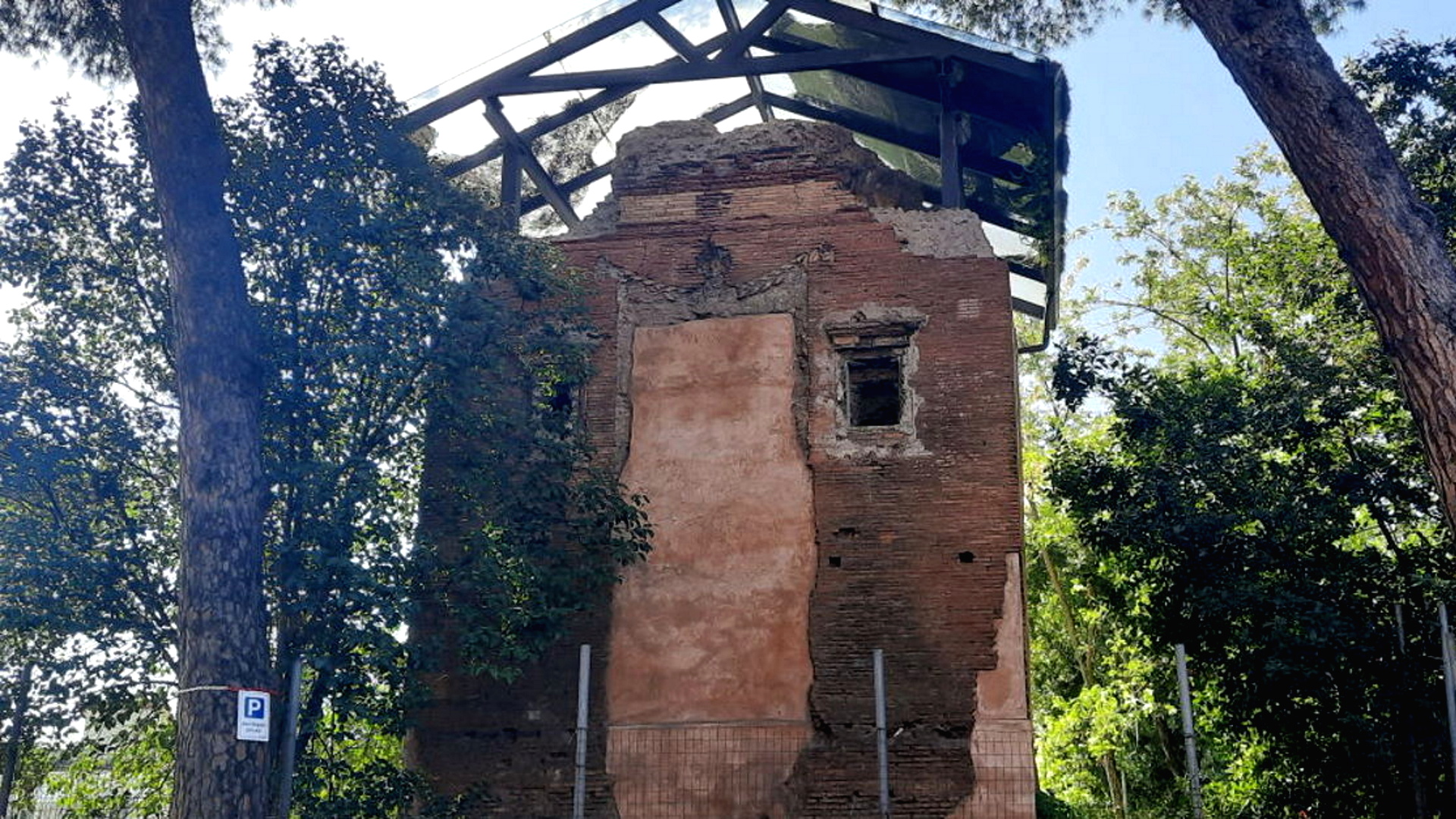 The monument is located on the left of the via Nomentana, km 9,200, at Aguzzano. It owes it name to the Cecchini family, owner in the 16th century of the land where the building is located. It is a shrine-shaped tomb in yellow and red bricks with a two level rooms. It dates back to the age of Antoninus (mid II century AD) and its front is embellished with festoon between two little windows, originally framed by pillars supporting a tympanum. On the exterior side walls we can see the traces of the stairs that led to the upper floor. The lower room’s ceiling is cross vaulted, the upper room is stuccoed with flower motifs, draped female figures and landscape scenes with a circular building. In the rooms there are some semi-circular and rectangular niches.
