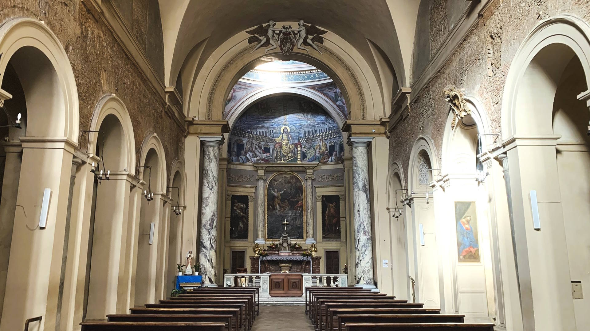 Inside you can admire the wonderful apse mosaic from the 4th century. The latter, among the oldest in Rome, can be dated between the 4th and 5th centuries. In the center is Christ depicted on a high throne, as Imperator Orbis Terrarum, the Lord of the whole earth, surrounded by the apostles - there are ten of them left, the others probably disappeared with the sixteenth-century renovations - and by two women offering him a crown each, whose identity is the subject of discussion: according to some they would be the sisters Pudenziana and Prassede, according to others, the personifications of the Ecclesia ex circumcisione (the Church of the Jews) and of the Ecclesia ex gentibus (the Church of the Gentiles or pagans ) who respectively crown their representatives, the apostles Peter and Paul. Only the figure of Christ has a halo and holds an open book in his hand, on which stands the inscription: Dominus Conservator Ecclesiae Pudentinae, "The Lord Protector of the Pudentine Church". The figures stand in front of a porticoed exedra, behind which the profile of a city can be glimpsed, which could be identified with Jerusalem. This interpretation is made plausible by the presence, in the center of the mosaic, of a cross covered with gems which, according to tradition, was erected on Calvary in 416 by Emperor Theodosius II, in memory of a miraculous apparition of the cross.
