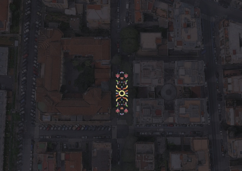 Inaugurated at the end of October 2025, Serena Gianoli’s work in Rome’s 7th municipality (Via Mondovì) represents the development of nature with a partially reflected design: the sun and water, essential ingredients for life, are placed at the center and on opposite sides of the image. The composition is inspired by the intrinsic harmony of the natural elements that sustain our ecosystem. The work occupies an area of 100 square meters. If treated with “smog-eating” paints, this surface can absorb a quantity of CO2 and polluting particulates equal to that of over 30 mature trees.