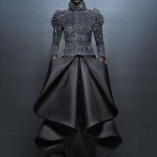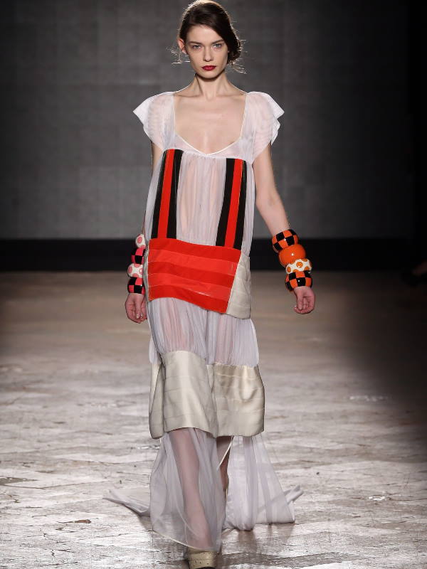 Per la raffinata e sperimentale eco-couture di Alessandro Consiglio, accompagnati dalle note del sopranista Paolo Anziliero adornato dai gioielli etici della DiamonDiamond srl di Andrea Falcioni, ecco splendidi cappotti realizzati con nastri di vecchi VHS lavorati all’uncinetto. Le Piccole spugne rubate ai lavori domestici diventano una cancellata del seicento che adorna un capo spalla di rara bellezza. Le borse di Marta Giacomini realizzate con le lastre di vecchie radiografie completano gli outfit di Consiglio. Materiali insoliti, Recycle che genera sindrome di Stendhal: un vero inno alla sostenibilità che non rinuncia al glamour.