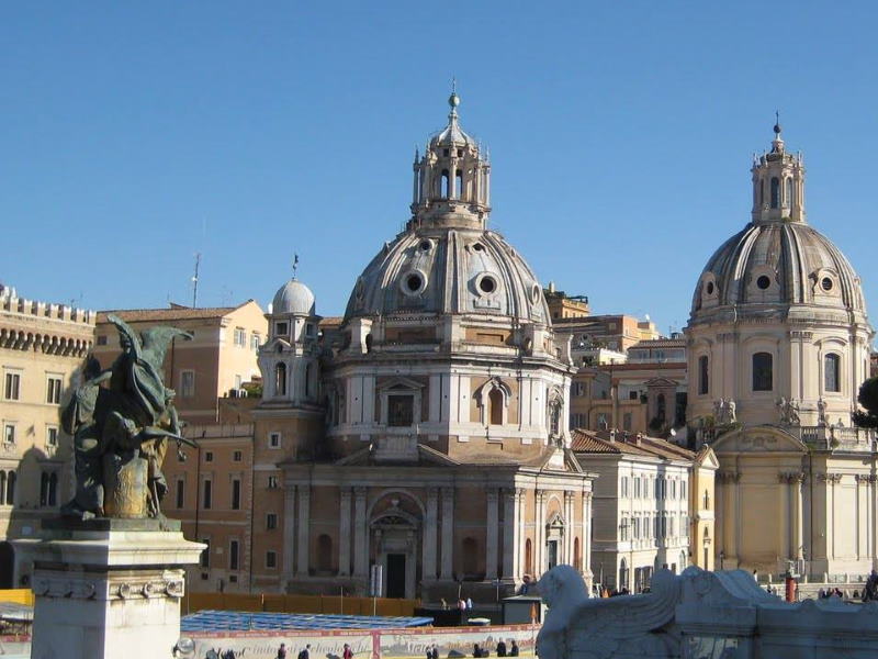 Nell’area del Foro di Traiano, in un angolo ancora oggi particolarmente suggestivo della città, esisteva una piccola cappella che fu donata alla fine del Quattrocento all’Università dei Fornari, una delle antiche corporazioni artigiane della Roma medioevale. Nel 1507 la confraternita fece abbattere la chiesa per costruirne una più grande: i lavori, affidati ad Antonio da Sangallo il Giovane, furono portati a termine circa settant’anni dopo da Giacomo Del Duca, allievo di Michelangelo, al quale si devono la bella cupola e il campanile dalle linee prebarocche. Un restauro complessivo di Santa Maria di Loreto fu eseguito nella seconda metà dell’Ottocento da Luca Carimini e Giuseppe Sacconi, il futuro architetto del Vittoriano. A poca distanza, nel 1741 era stata eretta nel frattempo la chiesa del Santissimo Nome di Maria che ne riprende le forme e ne è in qualche modo una riscrittura.