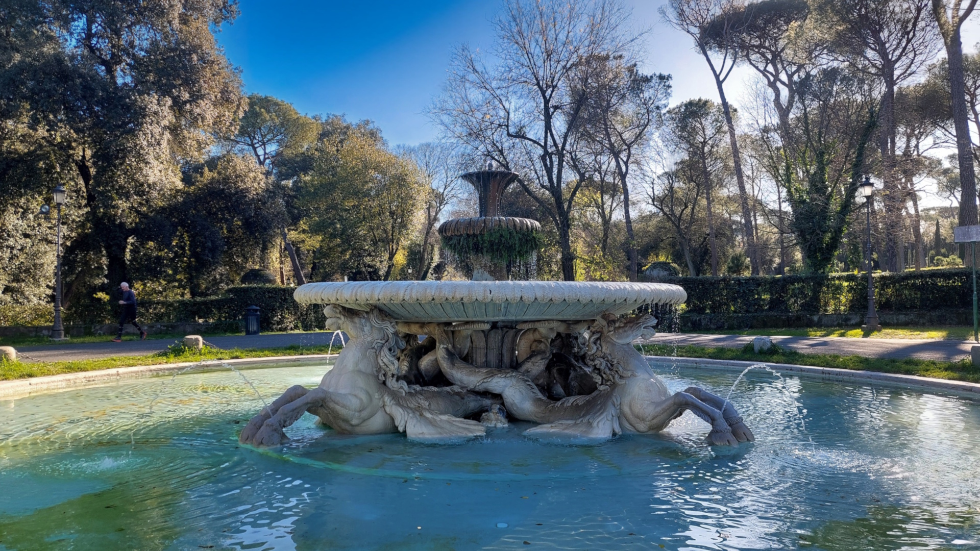 All’interno di una vasca circolare scavata nel terreno, affiorano dall’acqua quattro cavalli marini, con le zampe sollevate e i corpi a forma di pesce. I cavalli sorreggono con le teste e con le code una seconda vasca, più piccola, sormontata da un doppio calice finemente decorato con foglie d’acanto. Altri getti d’acqua zampillano tra le zampe dei cavalli e tra le loro code.