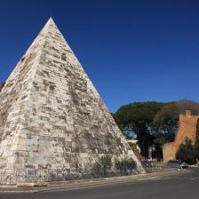 Uno dei personaggi che come sepolcro scelse una piramide fu Caio Cestio, pretore, tribuno della plebe e membro del Collegio dei Septemviri Epulones, magistrati che avevano il compito di organizzare i banchetti sacri in onore delle più importanti divinità, come si evince da una delle iscrizioni sulla facciata. La facciata presenta un’altra iscrizione che ci dice che i lavori di costruzione dovevano durare al massimo 330 giorni, pena la perdita dell’eredità da parte dei familiari. La tomba fu costruita lungo la via Ostiense, tra il 18 e il 12 a.C.. Quattro secoli più tardi, su iniziativa dell’imperatore Aureliano, fu inglobata nella nuova cinta muraria.